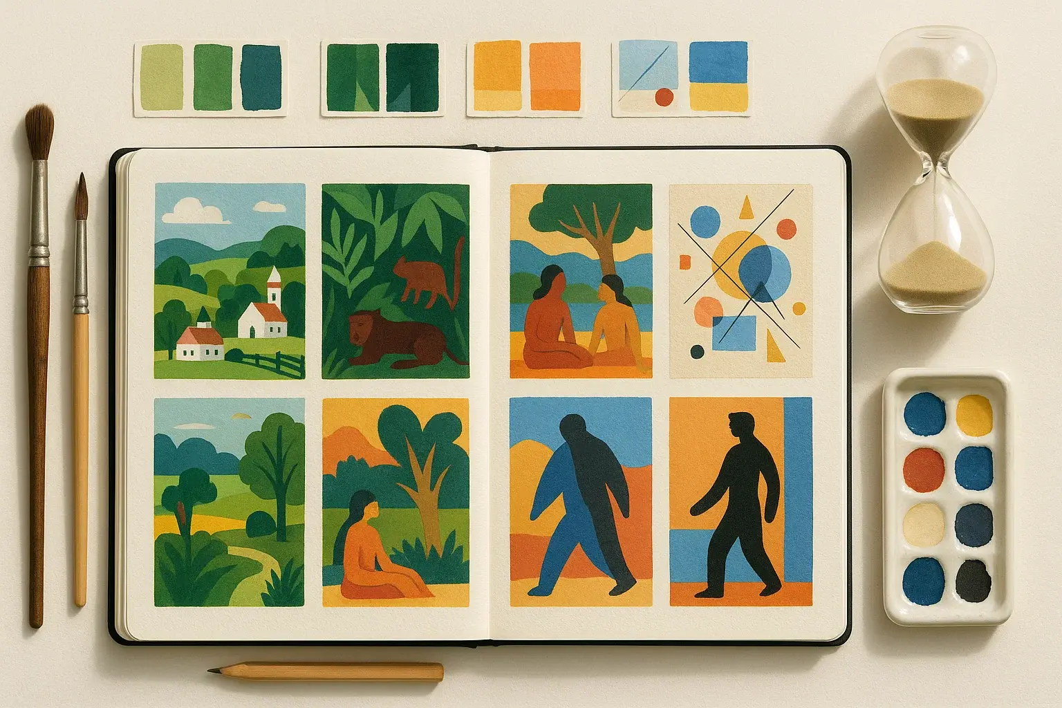 Упражнение: ограниченная палитра из 3 цветов; одно плоское цветовое поле как доминанта.
