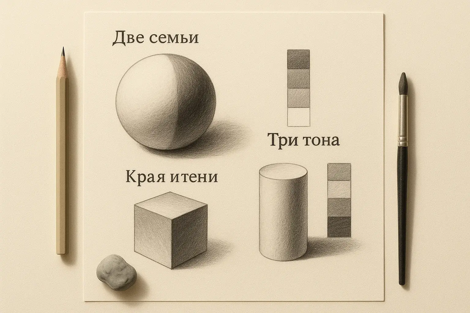 Коротко: сначала разбей сцену на две семьи — свет и тень, затем уточни три тона и иерархию краёв. Жизнь появляется там, где контраст и края управляют вниманием.