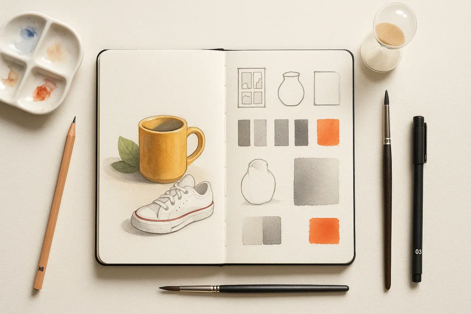 Скетчбук A5, карандаш HB/2B, лайнер 0.3, клячка. По желанию — мини-акварель: ультрамарин, охра, краплак.